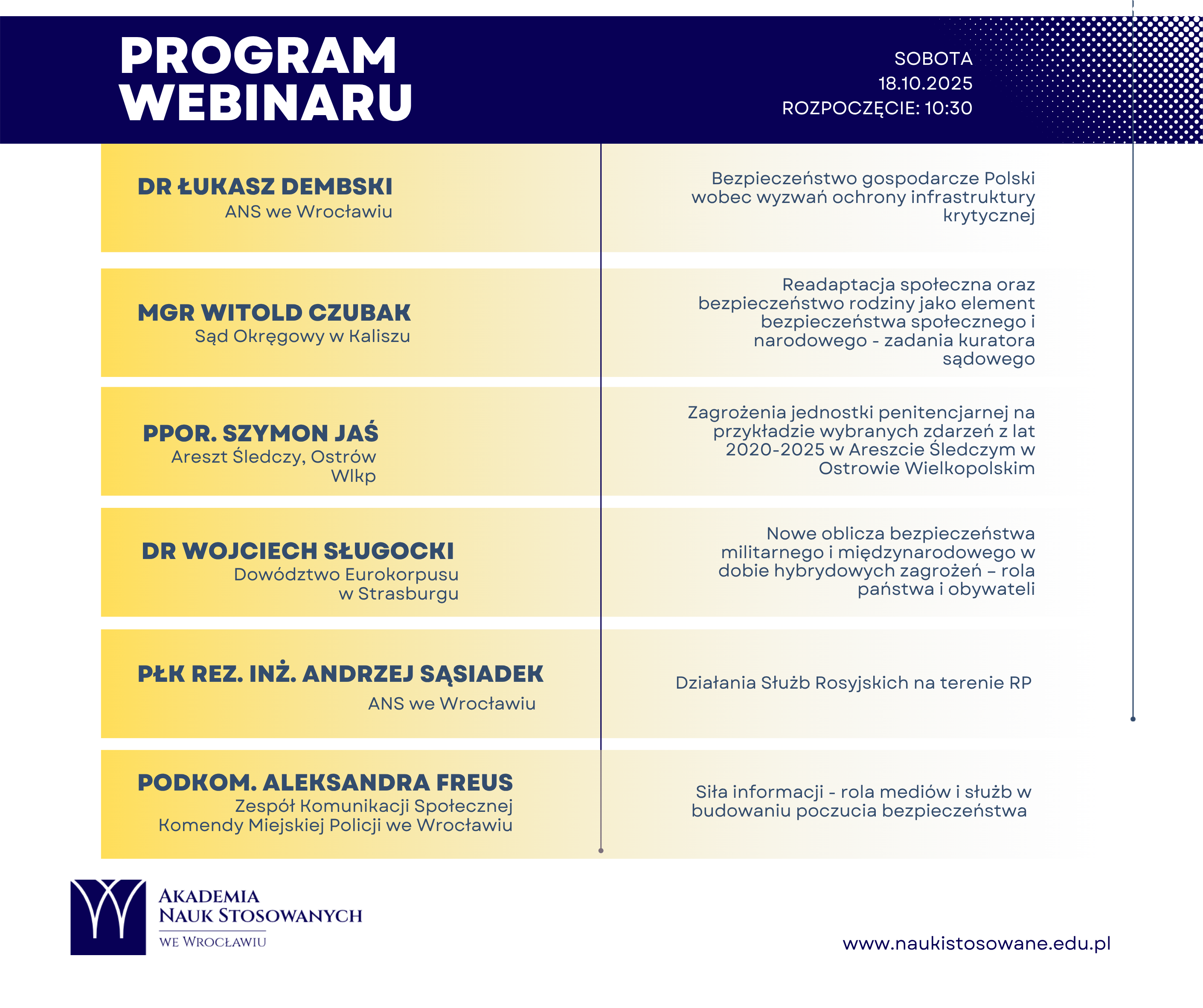 Omówione zostaną zarówno zagrożenia militarne, jak i niemilitarne Zaproszenie na inaugurujący rok akademicki webinar „Współczesne wyzwania bezpieczeństwa narodowego” – 18 października 2025 r.– takie jak dezinformacja, cyberataki czy kryzysy humanitarne.